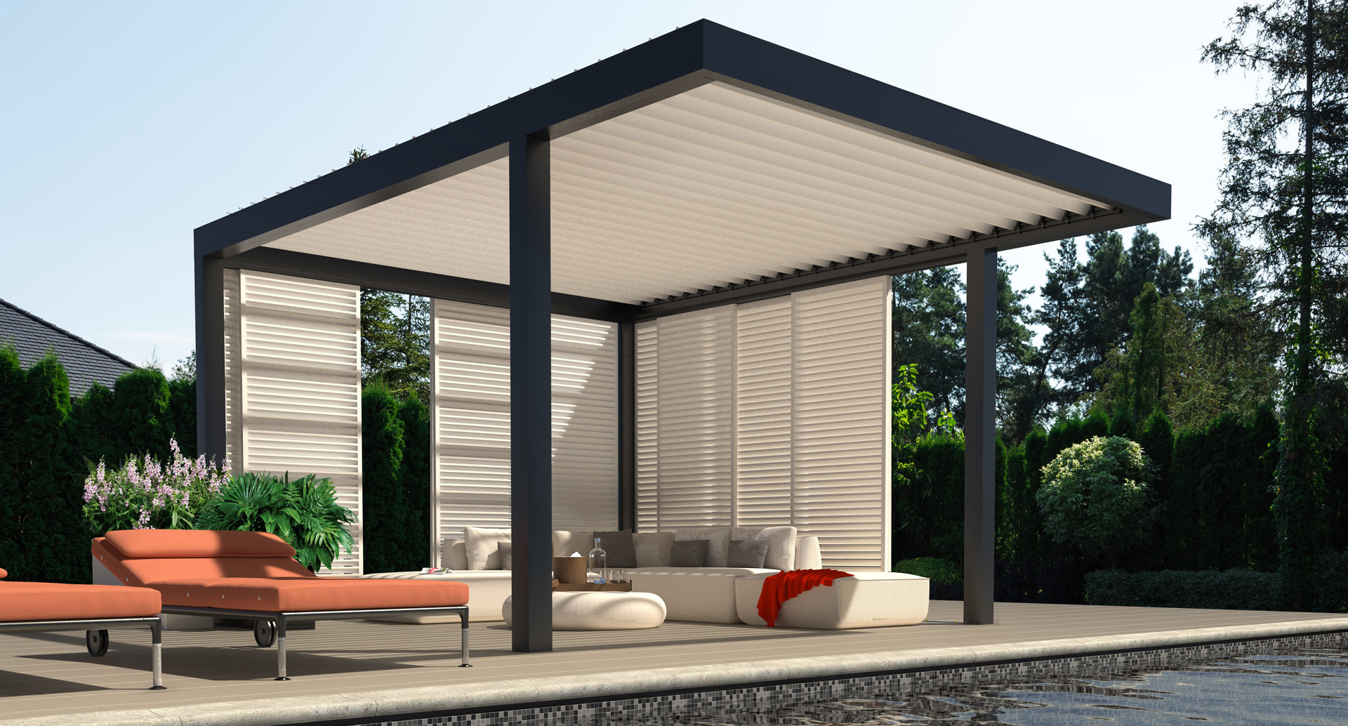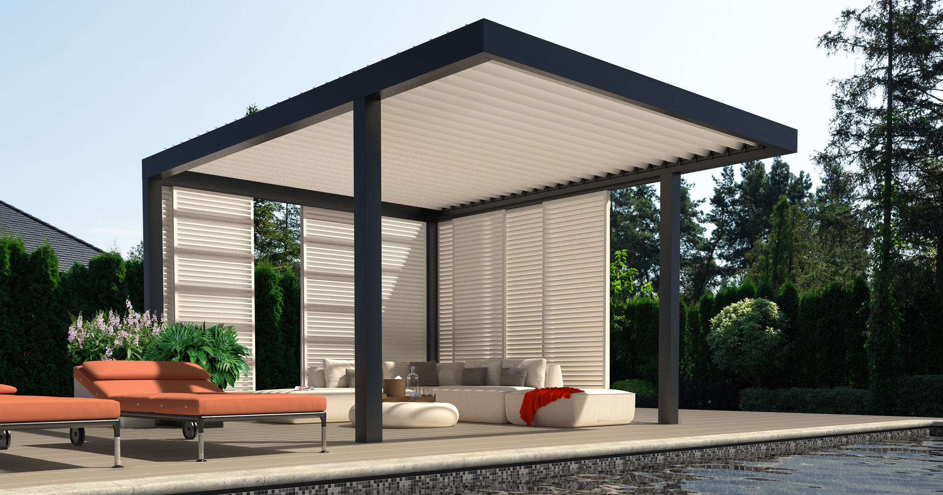 Για άμεση επαφή με το εξωτερικό περιβάλλον η EUROPA PERGOLA Bioclimatic συνδυάζεται με περιμετρικά σκιάδια (σταθερά ή συρόμενα), προσφέροντας προστασία από τον ήλιο και δημιουργώντας μια ατμόσφαιρα συνδυασμού φυσικού φωτός με σκίαση σε όλη την επιφάνεια.
