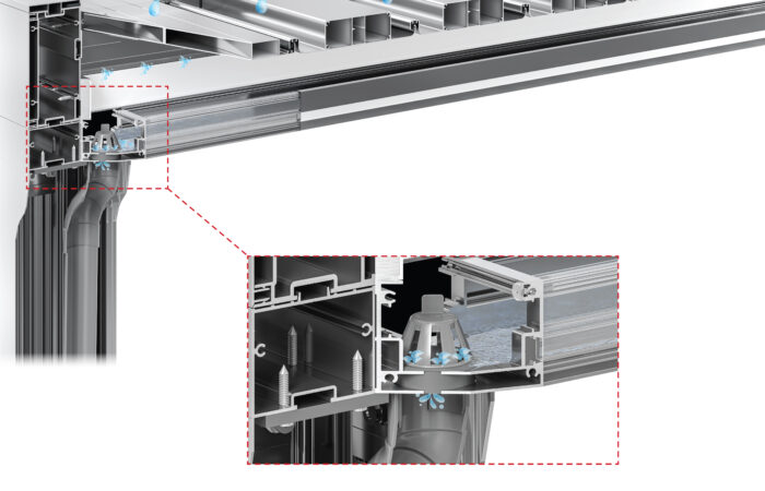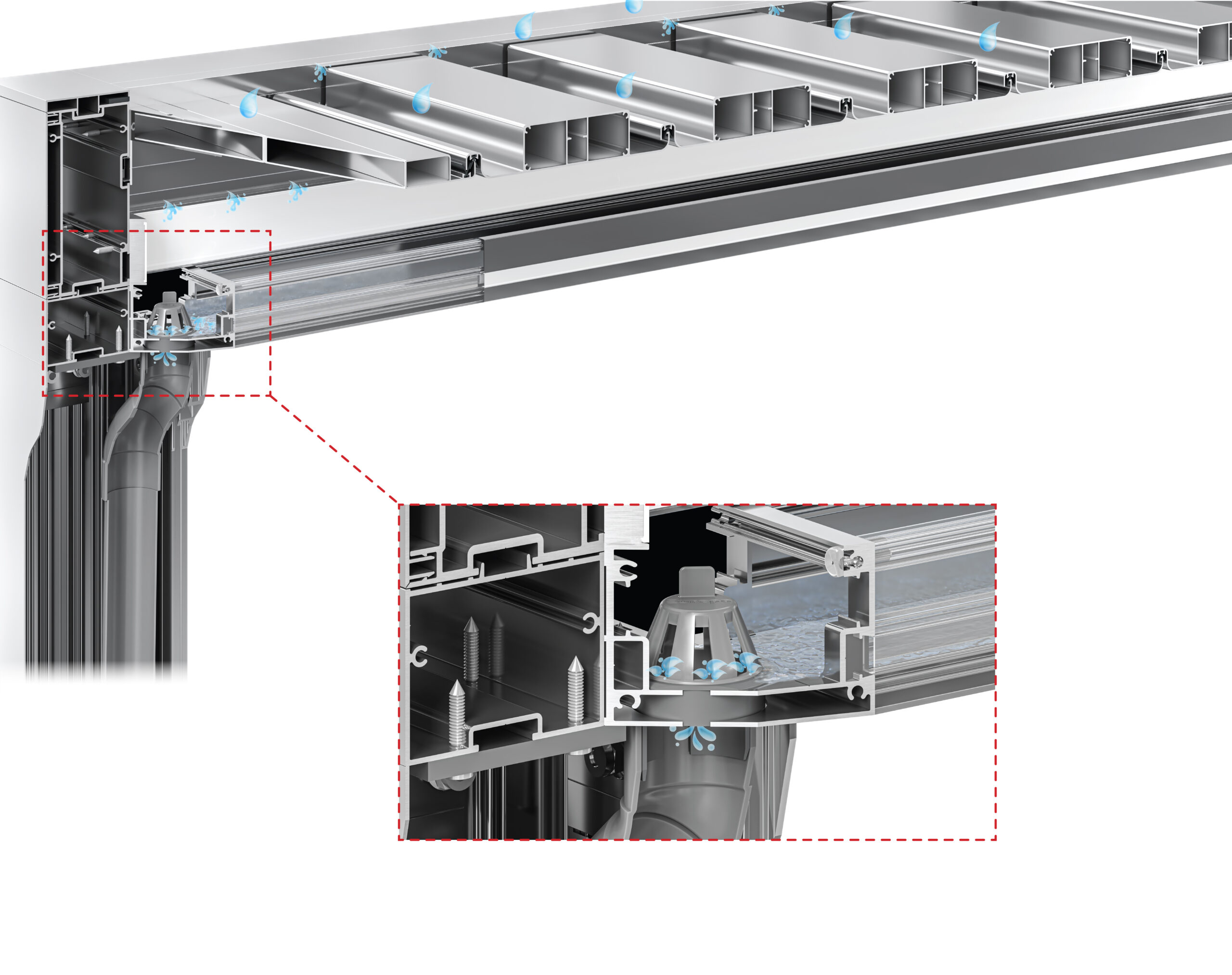 H σχεδίαση των πτερυγίων σε συνδυασμό με τον ειδικό συλλέκτη περιμετρικά των οριζόντιων δοκών του συστήματος, επιτρέπει την απορροή των υδάτων στο εσωτερικό της κάθετης κολώνας και τελικά στην έξοδό τους στην βάση του συστήματος εξωτερικά της καλυπτόμενης επιφάνειας.